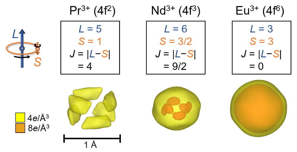 (下)各元素の原子核周りの4f電子密度の三次元分布。黄色で囲まれた部分はやや密度が高く、オレンジ色で囲まれた領域はさらに密度の高い領域である。J > 0 (Pr3+, Nd3+)では異方的な分布が観測されるのに対し、J = 0 (Eu3+)ではほぼ球対称な分布が観測された。Å(読み:オングストローム)は、1メートルの100億分の1の長さ。