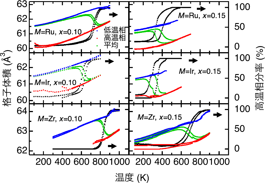 また、大型放射光施設SPring-8(用語11)(本研究で使用したBL名:BL02B2、BL13XU)の放射光X線回折実験(用語12)で結晶構造変化を調べたところ、体積の小さい常誘電相への転移温度がBiFeO3の1103 K(約830℃、Kは絶対温度の単位であるケルビン)から劇的に低下しており、Bi0.85Ca0.15Fe0.85Ir0.15O3では室温近傍で1.77%もの体積負熱膨張を示すことが分かりました。負熱膨張は、卑金属であるジルコニウム(Zr)を用いたBi0.85Ca0.15Fe0.85Zr0.15O3でも観測されました(図2)。今回見いだした物質の母物質であるBiFeO3は常圧下で合成可能なことから、今後の合成法の改善によって、安価で高性能な負熱膨張材料となることが期待されます。