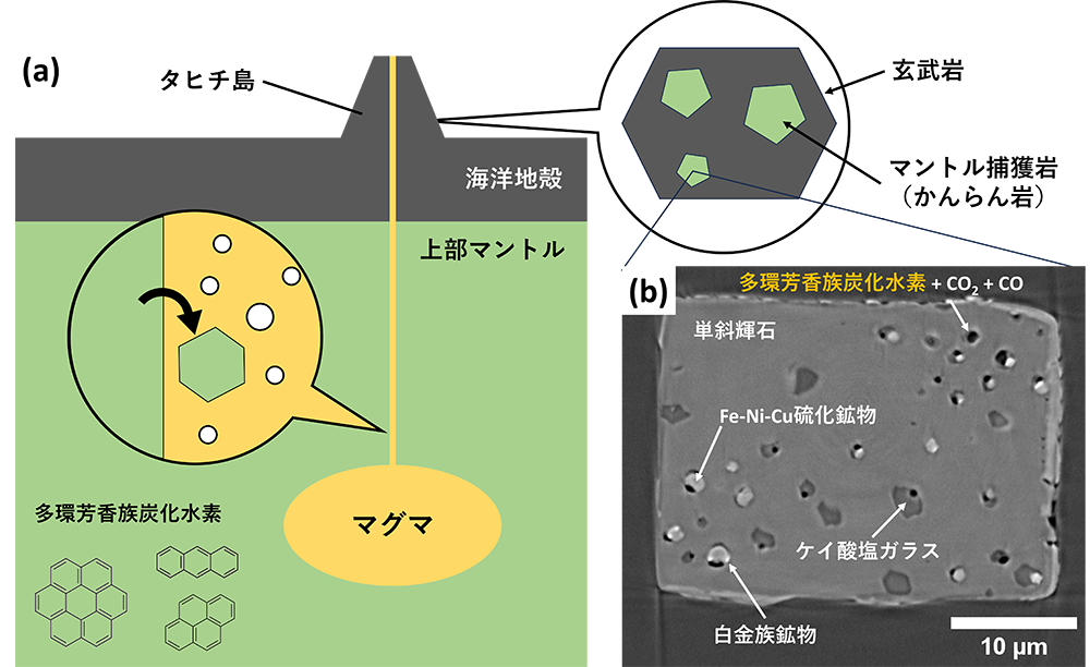 京都大学大学院理学研究科 三津川到 博士課程学生、三宅亮 同教授、伊神洋平 同准教授を中心とし、京都大学、広島大学、立命館大学、東北大学、高輝度光科学研究センター(JASRI)、早稲田大学、東京大学、高エネルギー加速器研究機構(KEK)物質構造科学研究所のメンバーで構成される共同研究チームは、南太平洋タヒチ島で採取されたマントル捕獲岩中の包有物から、多環芳香族炭化水素を主体とする有機物を発見しました。地球のマントル内部で生物とは無関係に有機物が合成されている可能性は古くから指摘されてきましたが、海洋下のマントルに由来する天然のマントル物質からそのような有機物を検出した例は極めて限られていました。本研究では、放射光X線CTや顕微ラマン分光法などの分析手法を用いて、マントル捕獲岩中の微小な包有物を解析しました。その結果、包有物内に多環芳香族炭化水素を主体とする有機物が、二酸化炭素や一酸化炭素とともに分布していることを明らかにしました。本成果は、生物が関与しない有機物合成が、海洋下のマントルでも起こり得ることを示すものであり、マントル内における有機物合成過程の全容解明に向けた重要な手掛かりとなることが期待されます。 |