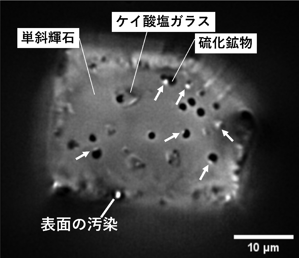 本研究では、フランス領ポリネシア・タヒチ島産のマントル捕獲岩※2中に含まれる単斜輝石※3内の微小な包有物(2–3マイクロメートル以下)を対象に、放射光X線ナノCT※4、顕微ラマン分光法※5、蛍光顕微鏡、走査透過型X線顕微鏡法(STXM)※6など、複数の分析手法を用いて詳細な解析を行いました。大型放射光施設SPring-8※7(BL47XU)における放射光X線ナノCT撮影の結果、包有物は白金族鉱物※8、Fe-Ni-Cu硫化鉱物、ケイ酸塩ガラス、およびそれらと共存する軽元素物質で構成されていることが明らかとなりました(図1)。
