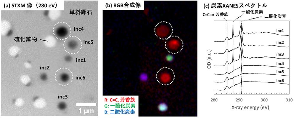 さらに、この軽元素物質について顕微ラマン分光法、蛍光顕微鏡、およびKEKの放射光施設フォトンファクトリー※9(BL-19A)に設置されたSTXMを用いて詳細に分析したところ、多環芳香族炭化水素※10を主体とする複雑な有機物が、二酸化炭素や一酸化炭素と共存していることがわかりました(図2、図3、図4)。本研究では、鉱物中に完全に包有された状態で有機物を検出したことから、これらの有機物が地表付近や分析過程に由来する汚染ではなく、マントル内部で生成されたものである可能性が高いことが示されました。これにより、生物が関与しない有機物合成が、海洋下のマントルでも起こり得ることが示されました。