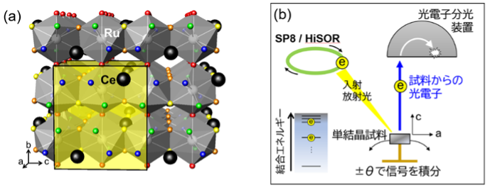 図1 CeRu2Al10の結晶構造、ARPES実験のセットアップ
