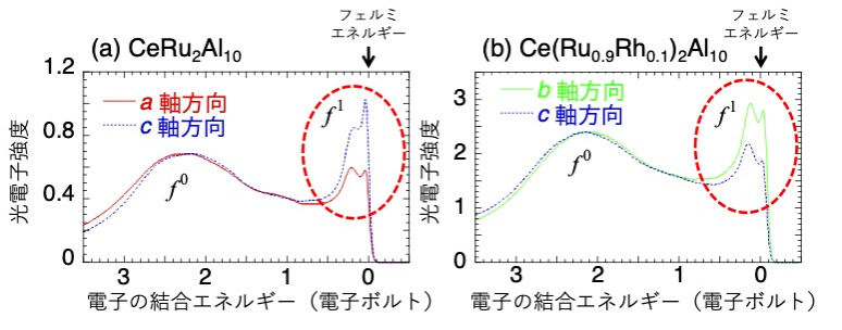 ARPES測定のデータを、結晶のa、b、c軸方向に積分した図。「f 1」と示した信号が強い場合に c-f 混成が強い。CeRu2Al10では c 方向の c-f 混成が強いが(a)、Ce(Ru0.9Rh0.1)2Al10では b 軸方向に強いことが明瞭に分かる(b)。これは、リフシッツ転移がRh置換で生じたことを示している。こうしてわずかなRh置換により、c-f 混成の強い方向が切り替わることを実験的に初めて明らかにした。