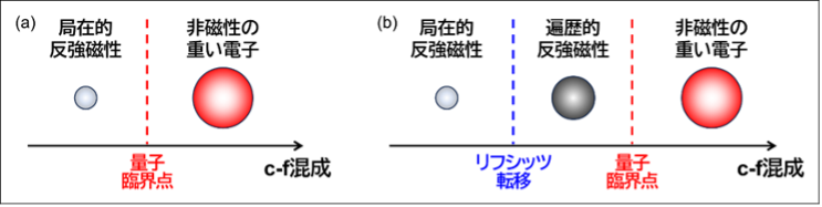 (a)ドニアック相図の概念。c-f 混成が弱い領域は局在的な反強磁性、強い領域は非磁性の重い電子状態。両者は量子臨界点で隔てられる。量子臨界点とは相転移が起こり物質の状態が大きく変わる場所。(b)拡張されたドニアック相図。中間に遍歴的な反強磁性の領域が割り込む。局在的な反強磁性の領域とは、リフシッツ転移で隔てられている。図中の円により、c-f 混成が等方的であることを象徴的に示す。