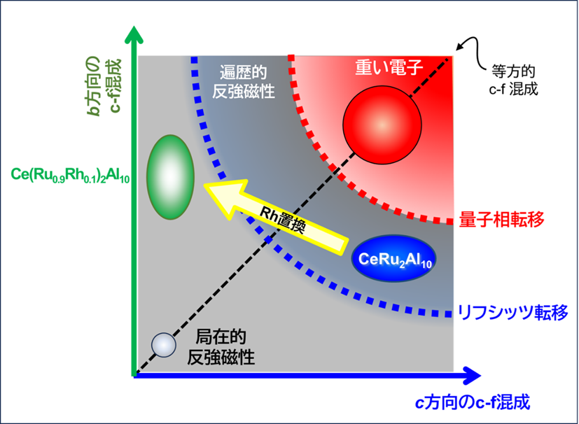 CeRu2Al10は c 軸方向の c-f 混成が強いため、相図の右側の領域、すなわち c 軸方向の c-f 混成が強い領域に位置付けられます。このとき、c 軸方向に c-f 混成の強いことが、c 軸方向(横方向)に長い楕円で象徴的に示されています。同様に、Ce(Rh0.9Rh0.1)2Al10では、b 軸方向の c-f 混成が強いので、相図の左上に、b 軸方向(縦方向)に長い楕円で示されています。両者は青い破線で示すようにリフシッツ転移で隔てられていて、今回の実験のようにRhで置換することで、遍歴的反強磁性状態から局在的反強磁性状態へと移行します。その際、c-f 混成の強い方向が c 軸方向から b 軸方向へと大胆に入れ替わる様子が、黄色い矢印で示されています。