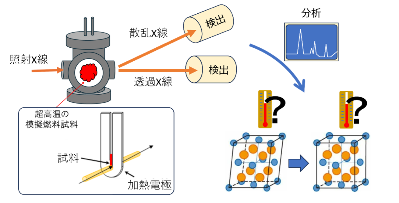 原子力発電では、原子炉の中で核燃料が非常に大きな熱を生み出しています。通常は、冷却することで安定した状態が保たれていますが、もし冷却が止まると燃料の温度が急上昇し、周囲の材料を溶かしてしまう恐れがあります。こうした事故を防ぐためには、高温に強く、安全性の高い燃料が欠かせません。その開発には、ウラン燃料が超高温になると、どのように姿を変え、周囲の材料とどんな化学反応を起こすのかを詳しく知ることが必要です。しかし、燃料と周囲の材料が溶けて反応するような超高温での反応を観察することは困難で、これまでは理論的に推測するしかありませんでした。 研究チームは大型放射光施設SPring-8(注1)において、3000℃を超える超高温下で起こる物質の変化をリアルタイムで観察できる新しい分析技術を開発しました。試料を超高温に保ちながらX線を照射し、リアルタイム分析により反応の瞬間を捉えて、物質が「溶ける瞬間」を直接確認します。今回、模擬核燃料を用いた実験を行い、周囲の材料が高温で溶け、冷え固まるまでのプロセスについて、直接かつ原子レベルで明らかにすることに成功しています。この成果は、より安全な核燃料の開発に貢献できるとともに、航空宇宙分野などで求められる超高温に耐える新規材料の開発への応用も期待されています。 本開発は、国立研究開発法人日本原子力研究開発機構(理事長:小口正範、以下「原子力機構」)原子力科学研究所 物質科学研究センター 放射光科学研究グループの谷田肇技術主幹、小林徹研究副主幹、小畠雅明技術副主幹、福田竜生研究副主幹、国立大学法人福井大学(学長:内木宏延)附属国際原子力工学研究所の有田裕二教授、国立大学法人東京科学大学(理事長:大竹尚登、以下「Science Tokyo」)ゼロカーボンエネルギー研究所の伊藤あゆみ特任准教授、国立大学法人東北大学(総長:冨永悌二)金属材料研究所の小無健司特任研究員、国立研究開発法人量子科学技術研究開発機構(理事長:小安重夫、以下「QST」)放射光科学研究センターの矢板毅研究員によるものです。 本開発成果は、令和7年10月に日本化学会欧文誌「Bulletin of the Chemical Society of Japan」にて発表されました。 論文情報 高温環境での実験をリアルタイムに分析できる装置の概念図 |