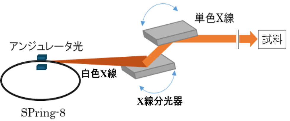 さまざまなエネルギーを持ったX線の中から、特定のエネルギーのX線だけを抜き出す装置です。シリコンなどの結晶による反射を利用しています。