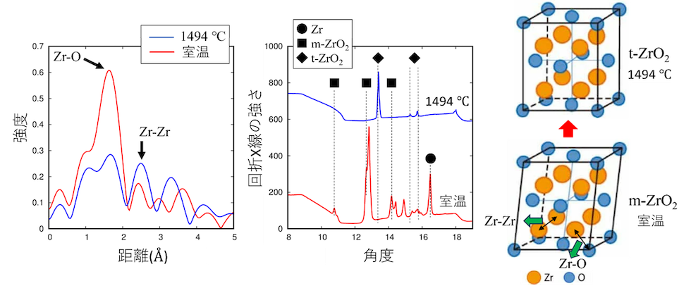 XAFS法測定(左)から、1494℃では室温と比べ酸素原子との結合(Zr–O)は弱まり、Zr同士の結合(Zr–Zr)が強まることが分かる。また、ZrO2自身の結晶構造が変化していることもXRD法(中)で確認した。幅広い温度領域で短時間に詳細なデータを取得できたことで、構造変化の過程をより精密に議論できるようになった。