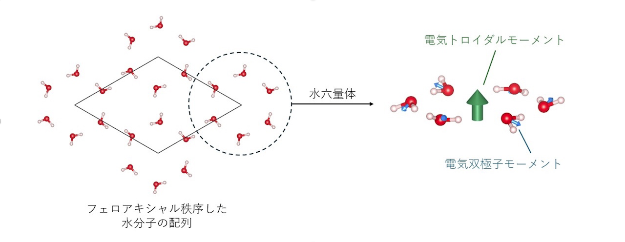 図2:水分子のフェロアキシャル秩序と水六量体。