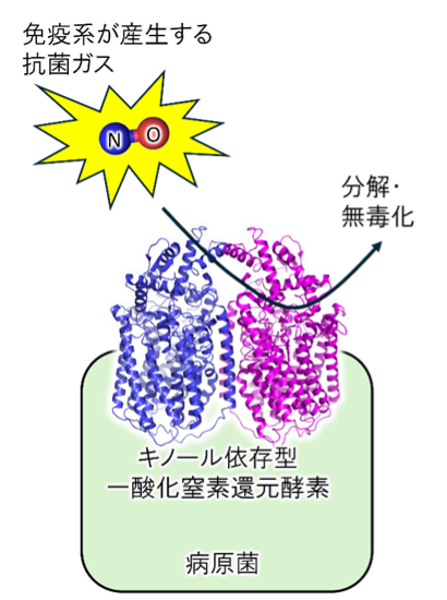 病原菌がヒトの体内に侵入すると免疫系が機能し、病原菌を攻撃します。その第一段階として、食細胞であるマクロファージ※6が病原菌を内部に取り込み、抗菌ガスであるNOを産出し、病原菌を殺菌します。これに対し、病原菌はqNORを用いて、NOを還元・無毒化します(図1)。実際に、髄膜炎菌のqNORを欠損させると、この髄膜炎菌は、ヒトのマクロファージ内で生きていくことができないことが分かっています。