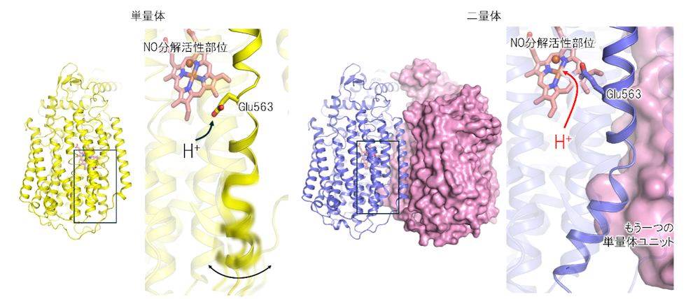 図2 qNOR二量体を形成することによる抗菌ガス分解活性化の仕組み。単量体では、二量体界面に位置するヘリックスが大きく揺らいでおり、このヘリックス上に存在するGlu563が抗菌ガス分解部位へプロトン輸送しにくい構造になる。二量体を形成すると、界面のヘリックスの動きが抑制されるとともに、Glu563がプロトン輸送に適した向きになることで、NO分解活性が向上する。