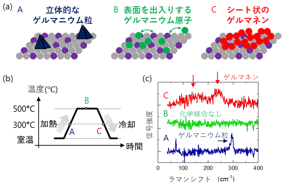 研究チームは、ゲルマニウム基板上に厚さ150 nm(ナノメートル、ナノは10億分の1)の銀薄膜を作製し、試料を真空中から外に出さずに500℃までの加熱と室温までの冷却を行いました。この間、レーザー光を用いるラマン分光法で作製中の状態変化を追跡し、図2(a)のようにゲルマニウム原子の状態を明らかにしました。