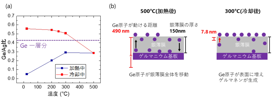 (a)XPSで表面ゲルマニウム量(Ge/Ag比)を分析したところ、500℃付近で初期条件に依らず同値に収束し、冷却で表面量が急増して「原子一層分」を上回る (b)銀薄膜中で動ける距離は500℃では約500 nmと長いが、300℃では約8 nmと短い。このため、ゲルマニウムが基板側へ逃げにくく、表面に集まりやすいため、ゲルマネン形成につながる(文献値に基づく見積もり、概念図)