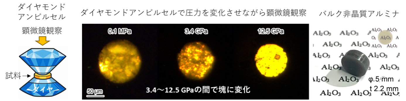 ギガパスカル(GPa:1万気圧)級の高圧を試料に印加して原子配列を再配列させ、密度や局所構造を変化させることで新しい構造・物性を持った材料を得る手法。本研究では、NIMSの超高圧制御グループのダイヤモンドアンビルセルを用いてバルク化の様子をその場観察で確認し、ベルト型高圧発生装置を用いた室温での加圧(9.4 GPa:9万4千気圧)によってバルク非晶質アルミナを合成した。