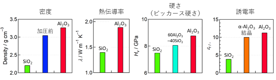 今回合成した非晶質アルミナの物性(赤)は密度、熱伝導率、硬さ(ビッカース硬さ)、誘電率のすべてにおいて代表的なガラスであるシリカ(SiO2)ガラスを上回った。また、硬さについては代表的な高硬度ガラスであるアルミノケイ酸塩(60Al2O3–40SiO2)ガラスを上回っている。誘電率においては、代表的な結晶相であるα‐Al2O3を超える値を示した。
