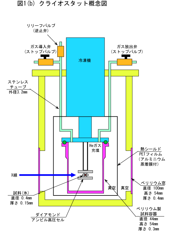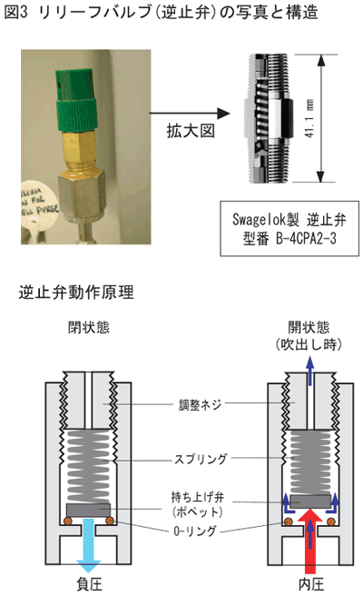 図1(a) クライオスタット全体図 図1(b) クライオスタット概念図 図2 クライオスタット下部破損部と詳細図 図3 リリーフバルブ(逆止弁)の写真と構造 |