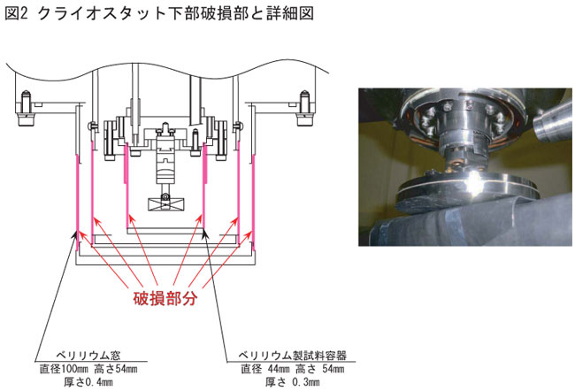 さる平成17年7月2日(土)に大型放射光施設SPring-8内の台湾ビームラインBL12XUでNSRRC(注1)が水(氷)についての電子構造研究実験を行っていたが、実験終了後の後片づけ時に、実験に使っていた実験用低温容器(クライオスタット)の中に入っている金属ベリリウム製試料容器(直径44mm、高さ54mm)が破損し、その破片が飛び散り、近くにいた研究者2名(オーストラリア国籍男性、フランス国籍男性)が負傷した。 なお、この時にはビームシャッターが閉じており、X線は出ていなかった。また、加速器やビームラインに対する影響はまったくなかった。