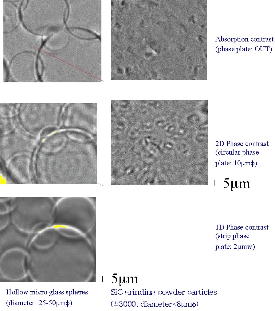 Using a gold quarter-wavelength phase-plate, positive phase contrast images were successfully taken. The microscope system was designed so that the 1D & 2D phase contrast images can be taken by inserting the phase plate and the absorption contrast images without the phase plate.