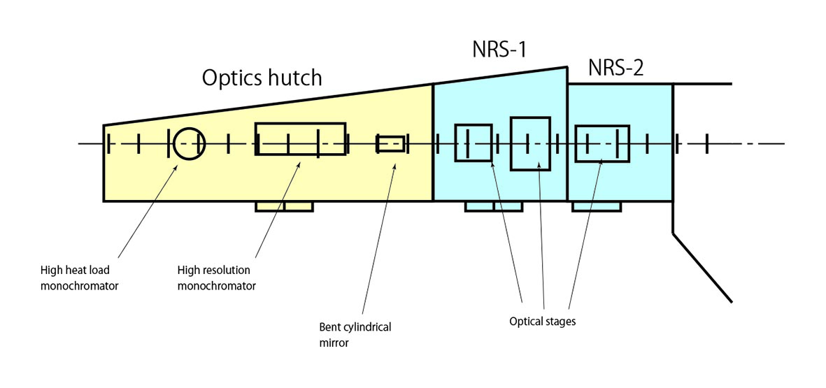 光学ハッチには液体窒素冷却ビームラインモノクロメータ、高分解能モノクロメータ、ベント型円筒ミラーが設置され、各手法や試料に合わせた光学系が選択されます。特定のエネルギー領域で強い強度を有するアンジュレータの特性から特定のエネルギー領域は利用出来ません。8keVから14keVおよび28keVから43keVの励起エネルギーを持つ核種の利用を希望される方はBL19LXUの利用をご検討下さい。またシングルラインメスバウアー光源を利用した実験をお考えの方はBL11XUの担当の方にお問い合わせ下さい。