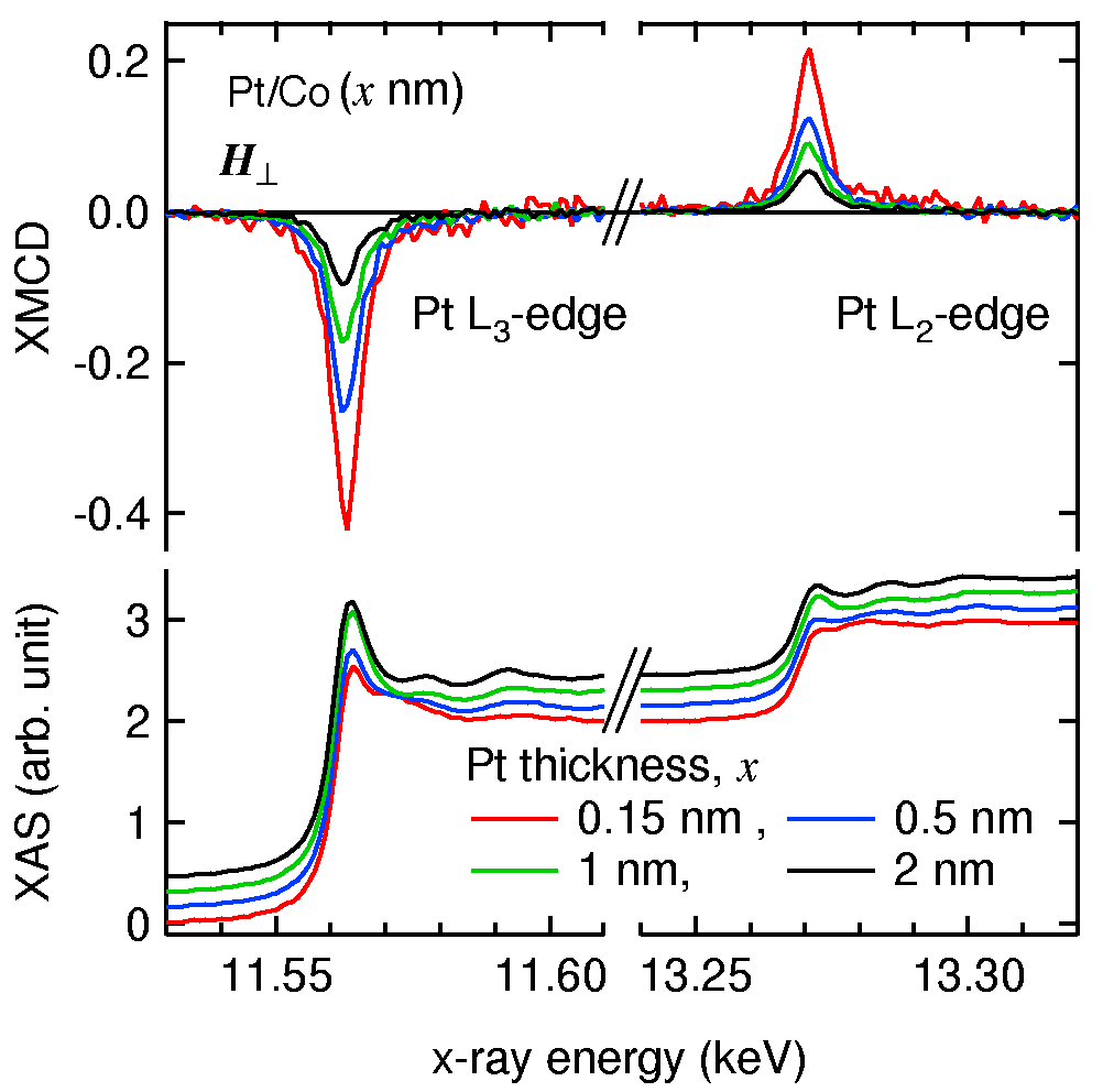 X-ray magnetic circular dichroism (XMCD) spectroscopy is a unique technique to study magnetism of a particular element in the magnetic sample. Using this technique, one can separate magnetization of each elements in a sample that consists of several magnetic elements or magnetic and non-magnetic elements. The technique allows high-sensitive detection of weak magnetization induced in non-magnetic elements, such as Cu, Pt, and Au. The figure shows XMCD spectra of Pt/Co bilayers with different Pt overlayer thicknesses. From an analysis of these data, the induced magnetic moment in an interface Pt atom was estimated to be 0.6 B. The depth profile of Pt magnetization was determined as a function of the distance from the Pt-Co interface.